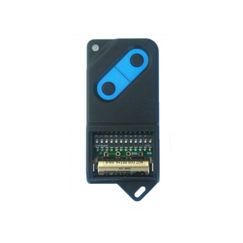 Radiocomando per cancelli Faac TM2 433DS DPH; guscio nero, 2 tasti neri, bordo celeste, frequenza 433.92 MHz codifica a 12 dip switch-12 levette, scritta FAAC di colore bianco o giallo oro. Art. 7873892