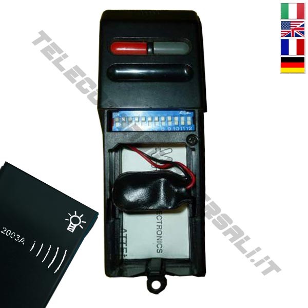 Radiocomando: Visa Electronics VRK 2003A Numero di tasti: 2 Colore tasto: Rosso e Grigio Colore guscio: Nero Frequenza: 305 MHz Codifica: A 12 dip switch (12 levette) – Codice fisso. Alimentazione: Batteria 9 Volt Codice fornitore: VRK2003A Dotazione: Pile e istruzioni per la programmazione incluse